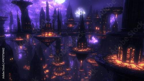 Obraz premium Sprawling alien city floating platforms neon lights and towering skyscrapers cinematic sci fi metropolis