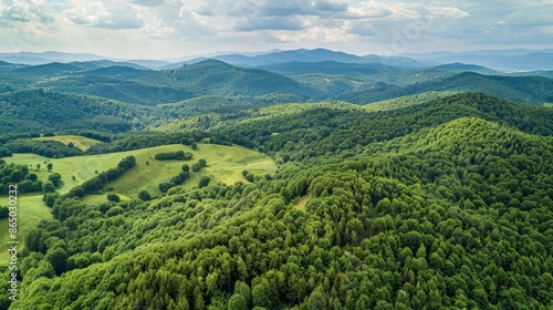 Obraz premium Sprawling green forest carpets rolling mountains under azure sky with puffy...