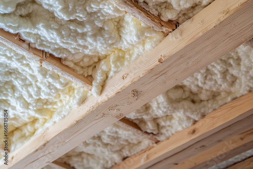 Obraz premium Spray foam insulation filling wooden ceiling joists home improvement project