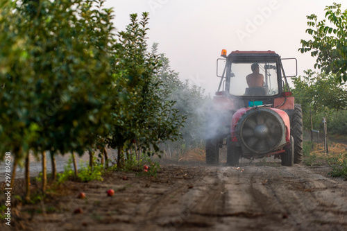 © Vesna, Fototapeta premium Spraying trees in fruit orchard against deceases
