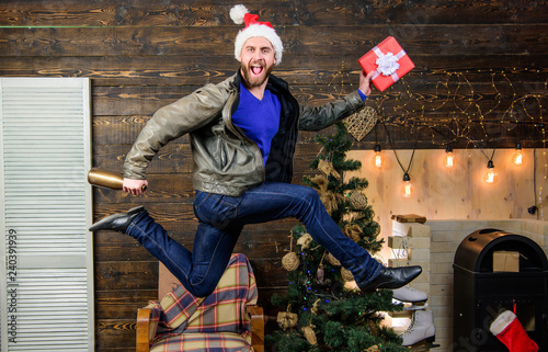 © be free, Obraz premium Spread happiness and joy. Bearded guy in motion jump. Delivery christmas present. Still have time. Delivery service. Gifts delivery. Man santa hat hurry to deliver gift on time. Christmas is coming