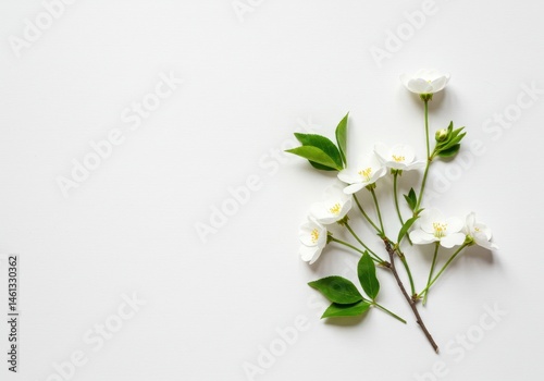 Fototapeta premium Sprig of delicate white flowers and green leaves arranged on a clean white background with copy space