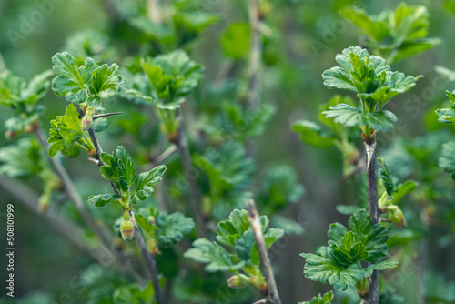 © Neils, Obraz premium Sprig of gooseberry with leaves in spring close-up