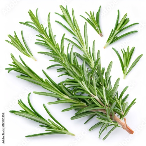 Fototapeta premium Sprigs and leaves of fresh rosemary, creating a visually appealing arrangement against a clean white backdrop