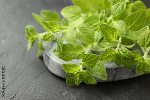 Fototapeta premium Sprigs of fresh green oregano on dark gray textured table, closeup