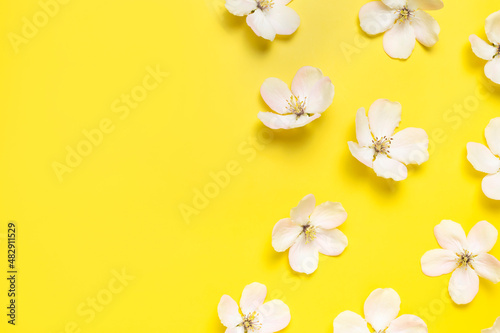 © olgaarkhipenko, Naklejka premium Spring background. Beautiful delicate fresh spring flowers and buds of apple tree on yellow background flat lay top view. Springtime nature concept. Bloom, inflorescence, flowering. Flower pattern