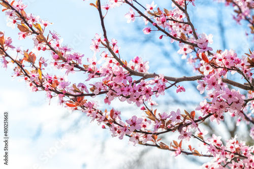 Obraz premium Spring background, flowering trees. Pink sakura flowers in sunny weather