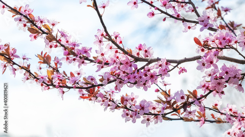 Obraz premium Spring background, flowering trees. Pink sakura flowers in sunny weather