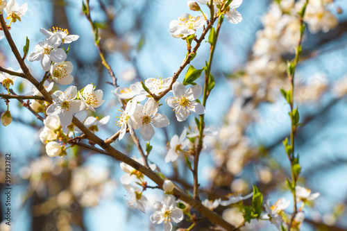 Fototapeta premium Spring background, flowering trees. Plum flowers on a tree in sunny weather