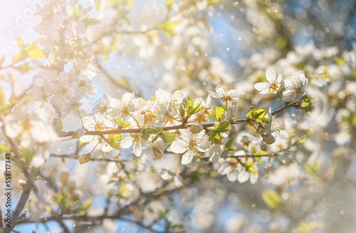 © rustamank, Obraz premium Spring background - flowers of plum tree, interlacing of branches, selective focus, close up
