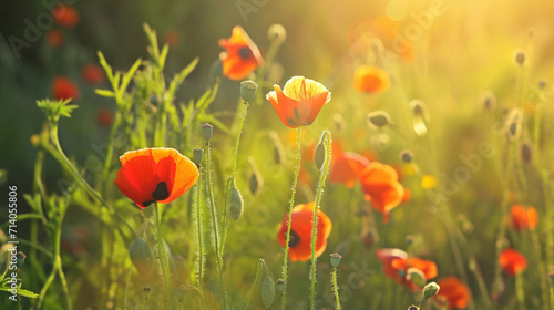 © Furkan, Obraz premium Spring background. Poppy Flowers On The Spring Field.slow Motion, Wind And Sun Light Nature. Copy paste area for texture
