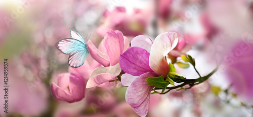 © Belight, Obraz premium Spring background with blooming pink magnolia flowers and flying butterfly.