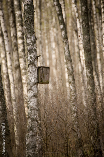 Fototapeta premium Spring birch forest with handmade wooden nesting box for birds hanging on a...