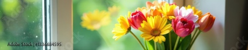 © Sathaporn, Fototapeta premium Spring bloom bouquet with colorful flowers on windowsill, stems, arrangement, spring