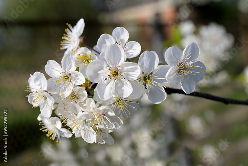 © Mykola, Fototapeta premium Spring blooming cherry flowers branch