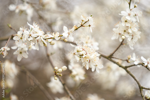Obraz premium Spring blooming of gardens. Tree branches with white flowers close-up on blurred background.