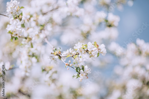 © Ann, Fototapeta premium Spring blooming tree, white flowers on trees, sunny spring day, bright blue sky