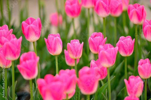 © qiujusong, Fototapeta premium Spring blooming tulip field. Flowers tulips, Spring floral background.