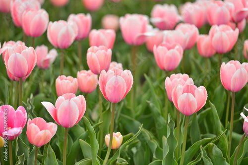 © qiujusong, Fototapeta premium Spring blooming tulip field. Flowers tulips, Spring floral background.