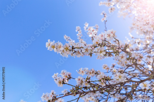 © Ирина Селина, Fototapeta premium Spring blossom background. Beautiful nature scene with blooming tree on sunny day. Spring flowers. Beautiful orchard in Springtime. Abstract background.