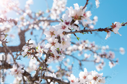 © Ирина Селина, Fototapeta premium Spring blossom background. Beautiful nature scene with blooming tree on sunny day. Spring flowers. Beautiful orchard in Springtime. Abstract background.