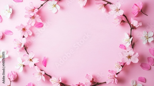 © Saranya001, Fototapeta premium Spring blossom circle flower arrangement pink background floral art aesthetic nature vibe