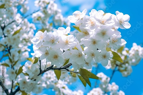 Obraz premium Spring blossoming cherry tree branches on blue sky background.