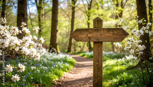 © Portraits, Naklejka premium Spring blossoms around wooden trail sign at nature reserve entrance