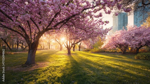 © musa, Fototapeta premium Spring blossoms in park at dawn