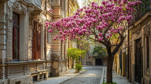 © Andi, Fototapeta premium Spring blossoms line a charming European alleyway.