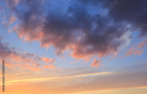 Obraz premium Spring blue sky at sunset with gray clouds.