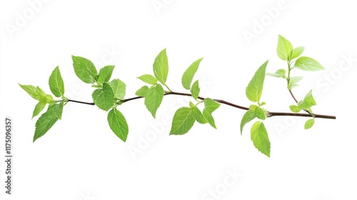 Fototapeta premium Spring branch with fresh green leaves on white background; nature, growth, renewal.