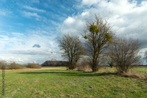 Obraz premium Spring bushes growing in the meadow and clouds against the blue sky