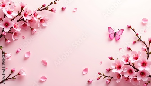 Fototapeta premium Spring Cherry Blossom Frame with Butterfly and Petals
