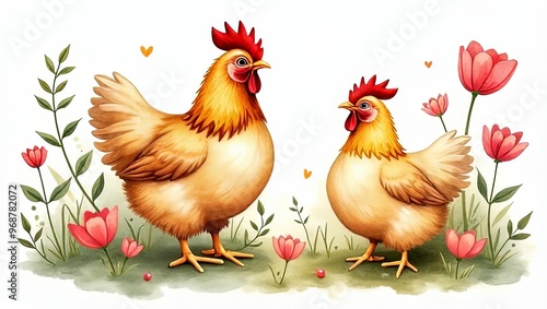 © pondolar, Fototapeta premium Spring Chicken Watercolor Flowers Design Spring Clipart