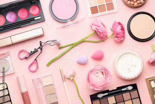 Fototapeta premium Spring composition with different makeup products and flowers on pink...