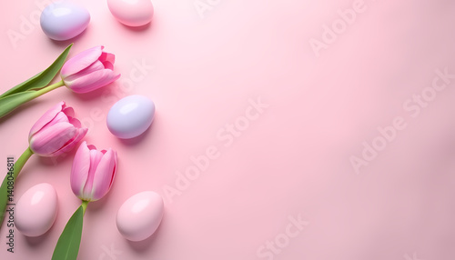 © Fox_Lisik, Fototapeta premium Spring composition with pink tulips and pastel Easter eggs on a delicate pink background.
