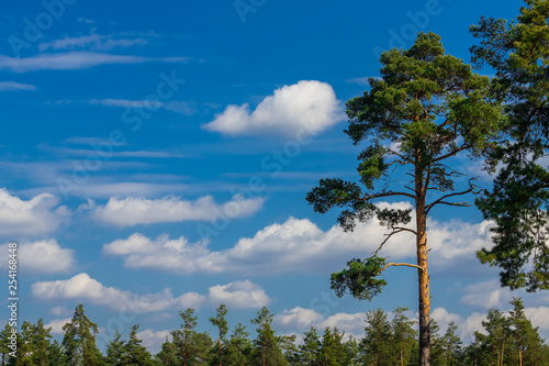 Obraz premium Spring coniferous forest sunny day blue sky