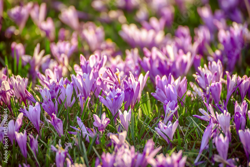 © Roxana, Fototapeta premium Spring crocus flowers in the green grass, Easter seasonal background