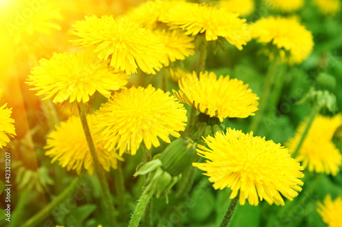 © Valerii Evlakhov, Naklejka premium Spring dandelion flowers as background