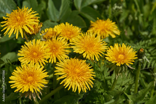 © Andrei, Fototapeta premium Spring. Dandelions bloom on a lawn in the Snezhet river floodplain.