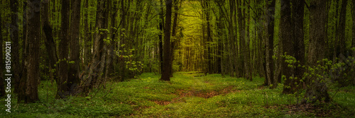 © gluuker, Naklejka premium spring deciduous forest. widescreen panoramic side view 15x5 format