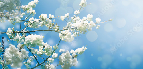 © Elena, Fototapeta premium Spring diffuse background with blue sky and branches of blooming sakura tree
