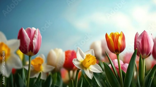 Fototapeta premium Spring Equinox day concept. Colorful Tulips and Daffodils Blooming in a Scenic Spring Meadow