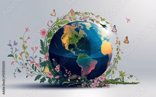 Naklejka premium Spring Equinox Spring Globe, Earth surrounded by flowers and butterflies (1)