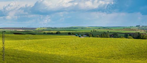 © wildman, Fototapeta premium Spring evening view with rapeseed yellow blooming fields in sunlight with cloud shadows.
