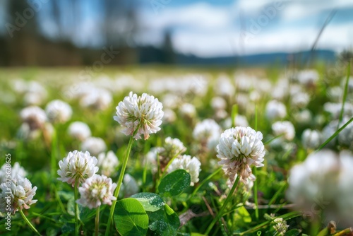 Obraz premium Spring field blanketed with white clover blooms and dewy petals
