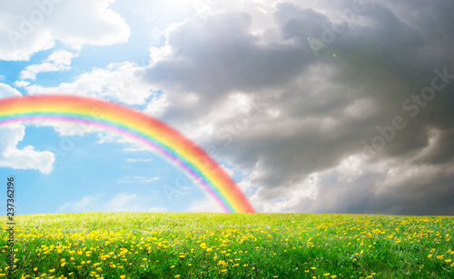 © andreusK, Naklejka premium spring field landscape with flowers and rainbow