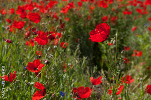 © Vera, Fototapeta premium Spring, Field of poppy flowers against the blue sky with clouds. The concept of freshness of morning nature. Spring landscape of wildflowers. Beautiful landscape long banner.
