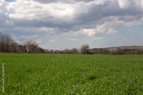 Obraz premium spring field with green grass and clouds